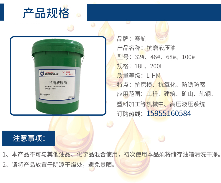 賽航抗磨液壓油系列是以精制的基礎油和高品質添加劑,采用先進技術水平的生產工藝調和而成,可廣泛用于工業設備中低壓液壓系統的潤滑。本產品按照40℃運動黏度分為32#、46#、68#、100#等粘度等級。