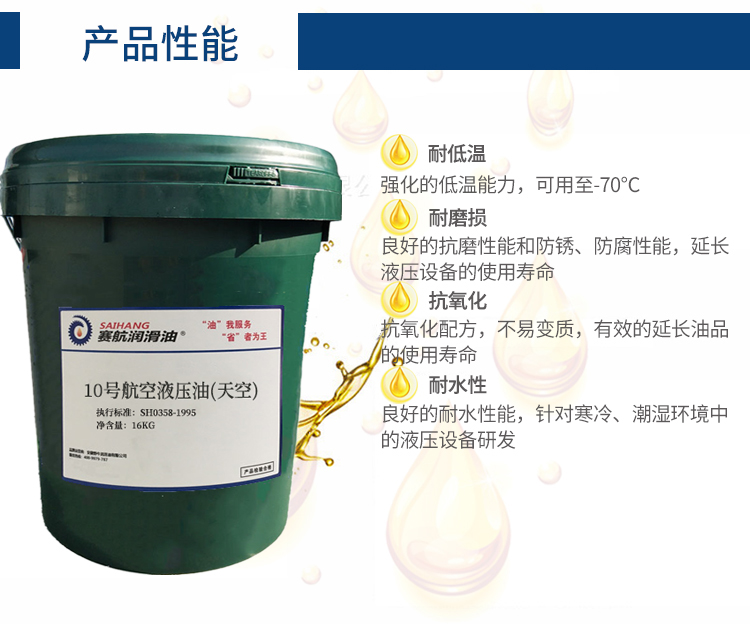 10號航空液壓油(空用)采用優質低凝礦物油為基礎油,外加防銹劑、抗氧劑、增粘劑、和染色劑,經多道工序精制而成。該油具備優異的低溫使用性能。耐磨性能和液力傳遞性能。主要應用于飛機起落架、減速板等航空領域的液壓設備。