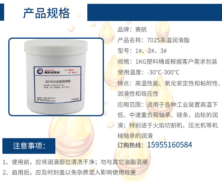 賽航7025高溫潤滑脂以無機稠化劑稠化合成油,并加入抗氧、防銹、結構改善劑等多種高效添加劑,經特殊工藝精制而成。適用于各種工業裝置高溫下低、中速重負荷軸承、鏈條、齒輪的潤滑;特別適于火焰切割機、壓光機、鼓風機、干燥箱、烘干爐等機械軸承的潤滑。